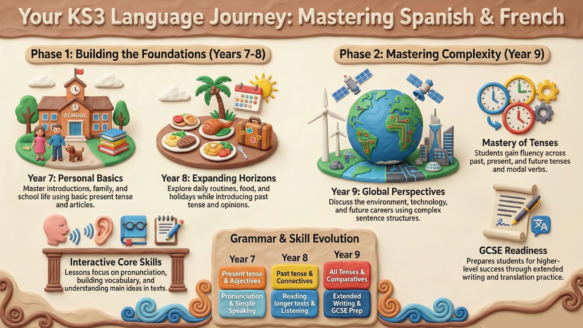 KS3 lesson plan structure for Spanish and French, designed for Year 7–9 students in the UK. This overview includes key themes, grammar points, and vocabulary.